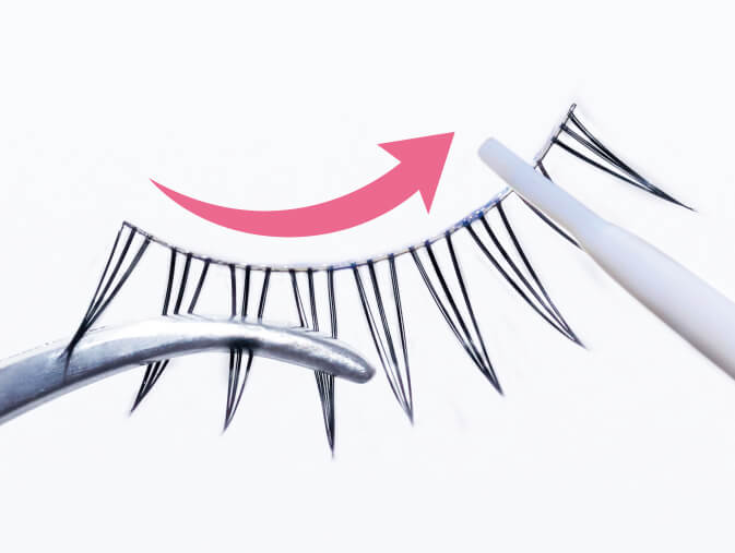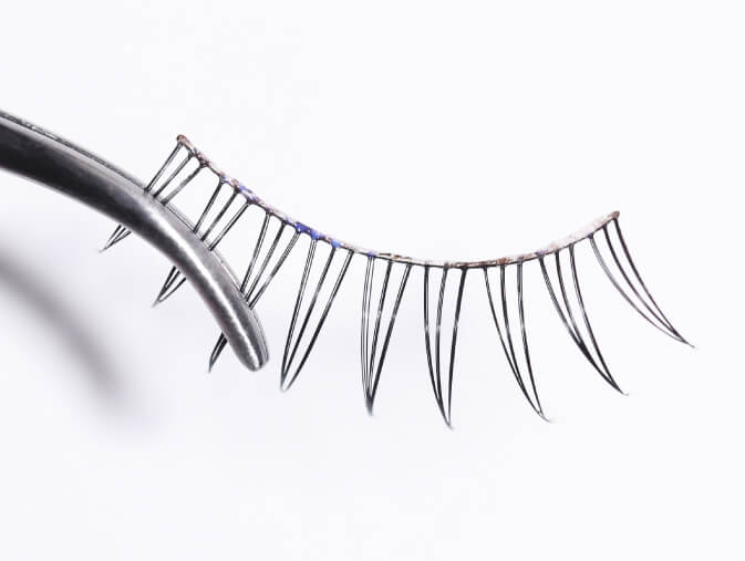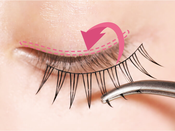 Apply the false eyelashes using tweezers from the center to outer corner, then the inner corner.