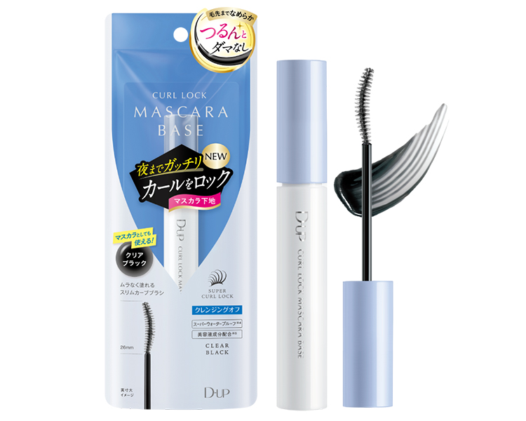 なめらかな塗り心地で毛先までキレイな上向きまつげを実現し、マスカラ前のひと塗りで夜までしっかりカールをキープします。自まつげになじむ「透け感ブラック」で、マスカラとしてもご使用いただけます。